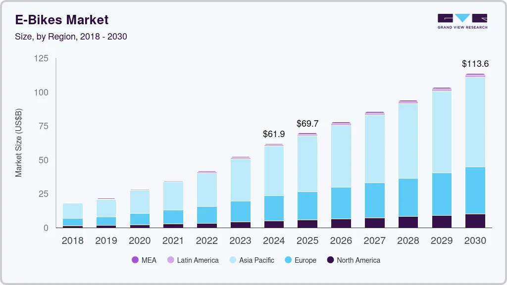 数据显示,2024 年全球 E-bike 市场规模约 618.9 亿美元,预计 2030 年达 1136.4 亿美元,年复合增速 10.3%;欧洲 2022 年已售出 540 万+ 台,2023 年接近或突破 600 万;美国 2019–2022 年累计增幅约 270% 至近 300%。