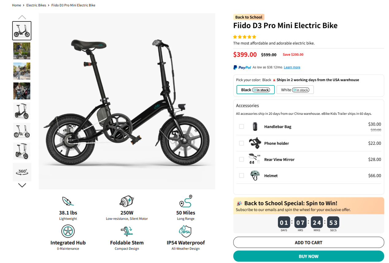 例如:Fiido D3 Pro,399美元售价,在欧美动辄1000~2000美元的价格区间里极具吸引力;续航79公里,满足多数城市通勤和周末短途;轻量化铝合金车架+折叠结构,收纳后直接进后备厢;官方两年保修+终身售后,让用户敢花钱。