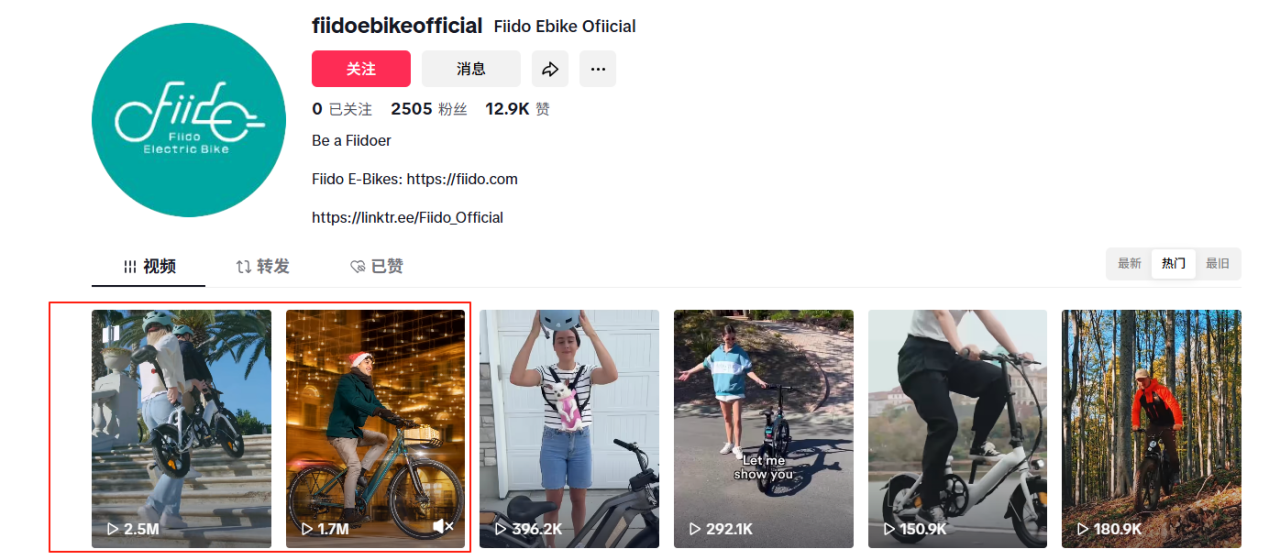 TikTok是Fiido的破圈利器。官方账号虽然粉丝不多,但跑出了两条百万级爆款视频。其中一条250万播放的内容,仅用“开车到郊外—取出折叠E-bike—骑着看风景”的简单情节,就让便携、轻快、易用的卖点一目了然。