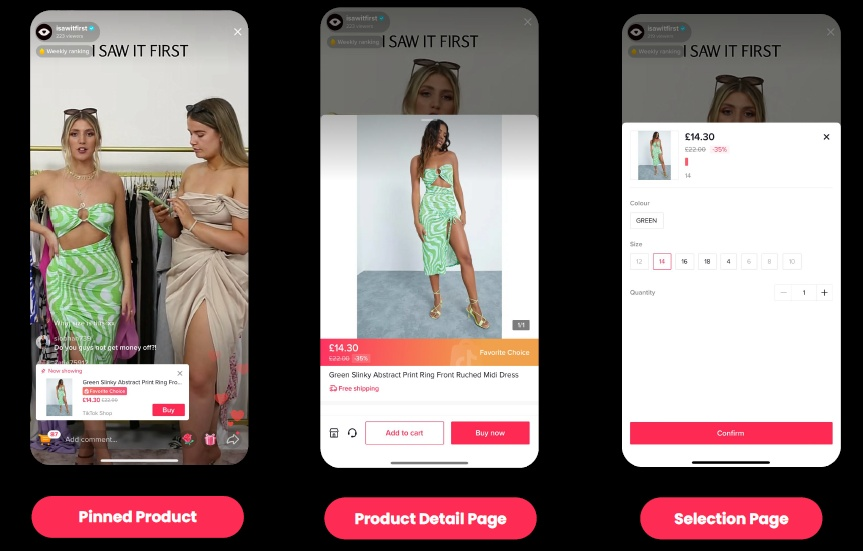 通过固定产品、展示价格和优惠,用户可以在直播中一键进入详情页并完成下单,实现“看见即购买”。