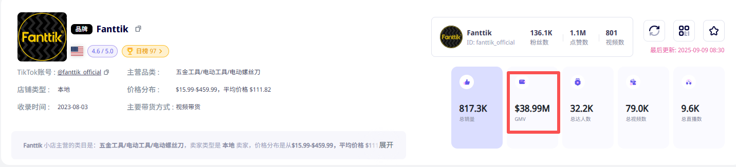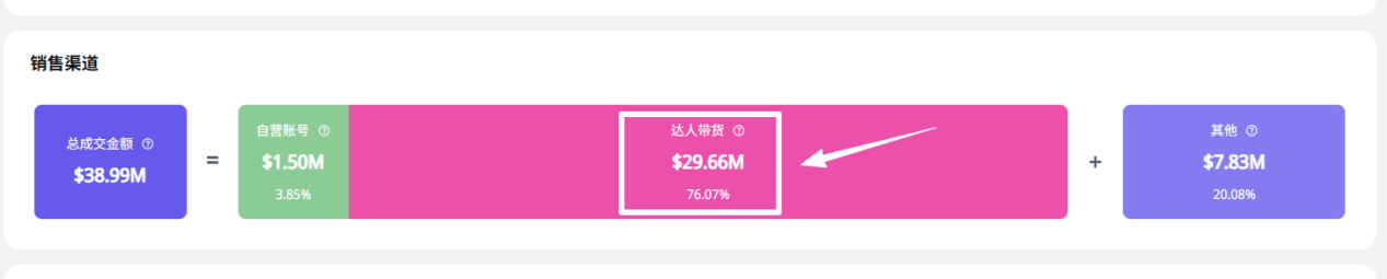 Fanttik 的 TikTok 策略有两个关键词:中腰部达人 + 可复制内容。数据显示,达人带货占店铺销售 76.07%,自营仅占 3.85%,视频成交占比高达 79.9%。