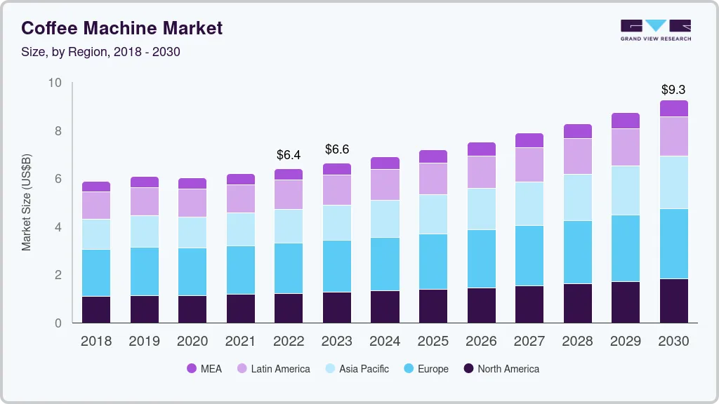在咖啡消费持续增长的浪潮中,全球咖啡机在2022 年市场规模约为 64.1 亿美元,预计到 2030 年将增长至 92.6 亿美元,年复合增长率约为 4.7%。