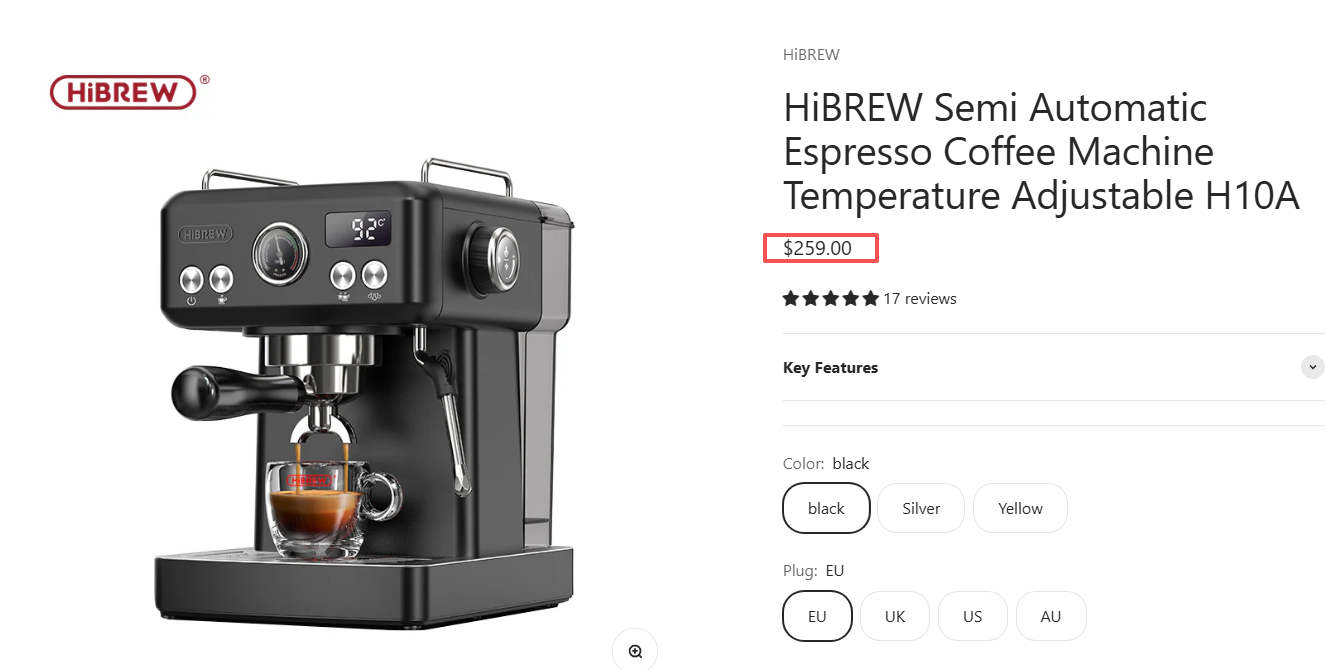 以HiBREW H10A 半自动机 为例,官网标价约259美元,相比动辄五六百美元起步的国际品牌,更易被本地消费者接受。