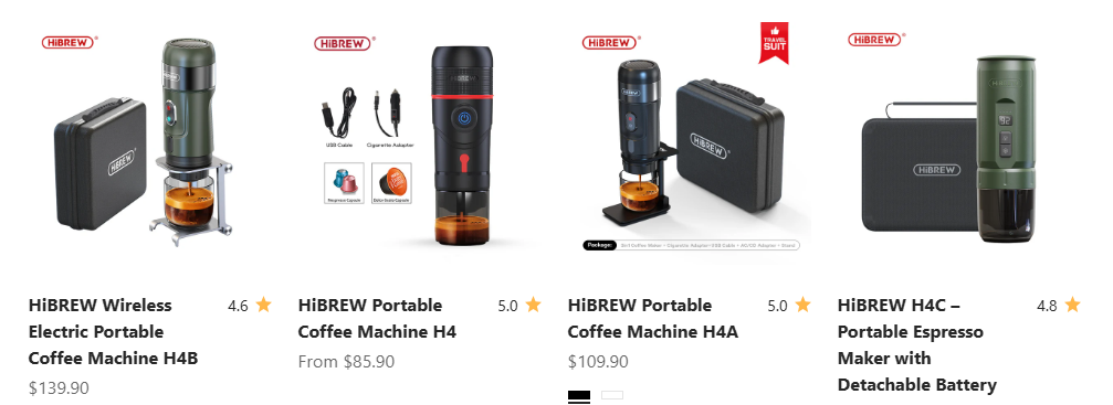 在美国市场,主打便携与多胶囊兼容,如Portable Espresso Maker(便携浓缩机) 系列,涵盖 H4C、H4B、H4D 等型号,满足用户“随时随地喝一杯”的生活方式;
