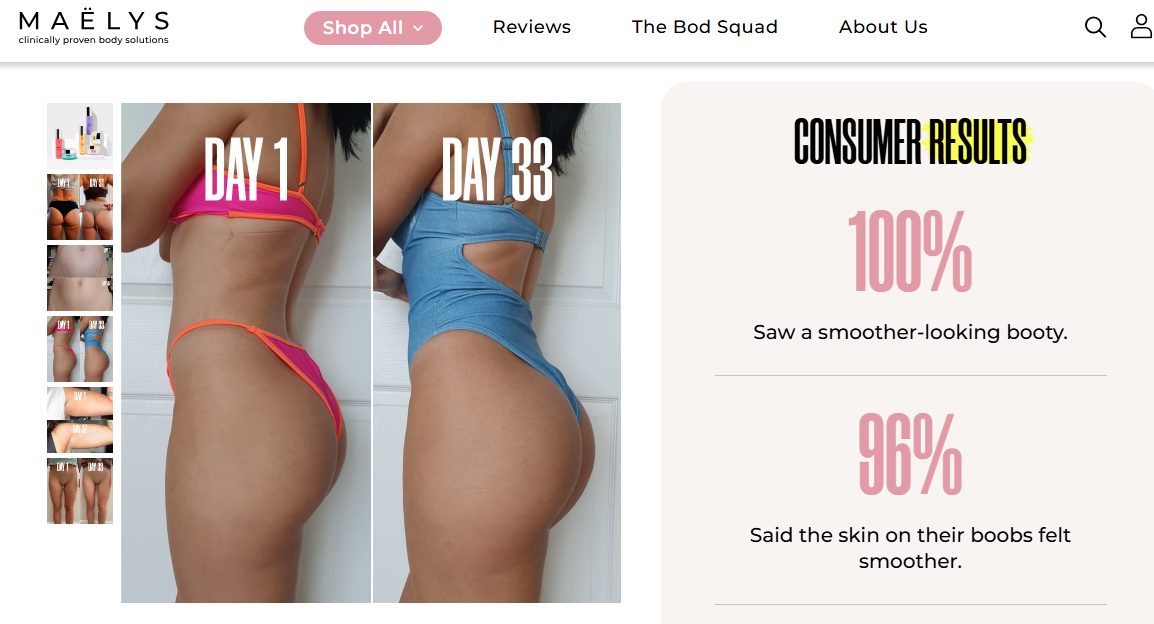 比如:B-Tight 臀部紧致霜上线后,Maelys 在官网公开临床数据:超过90%用户在短期使用后反馈肌肤更紧致、更光滑。