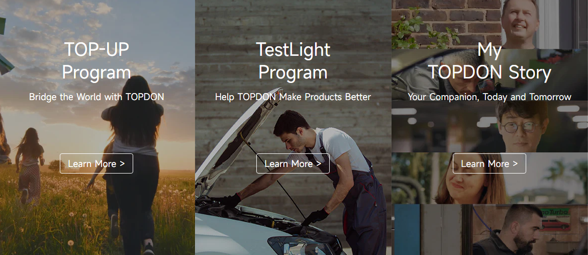 除了产品展示,TOPDON也在与用户建立更深的连接。通过 “TOP-UP 计划”(TOP-UP Program)和 “TestLight 计划”(TestLight Program),邀请用户参与测试与反馈,逐步形成品牌社区。同时结合 “连接世界的桥梁”(Bridge the World with TOPDON)等品牌故事,让品牌形象更立体、更具温度。