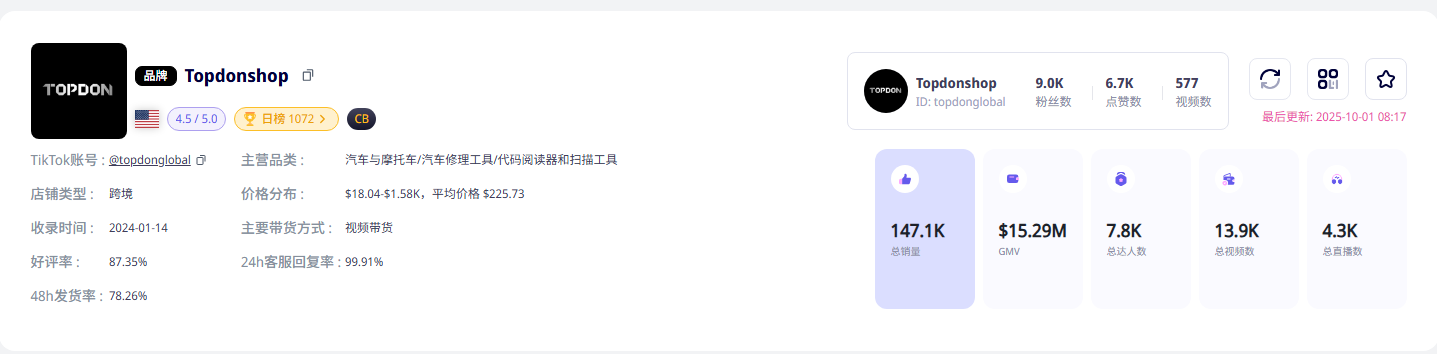 数据显示,TOPDON 在 TikTok Shop 的累计 GMV突破 1 亿元人民币,同时带动亚马逊和 eBay 的销量上涨超过 30%。短视频引发的关注,也顺势把流量带回了其他平台,形成良性循环。