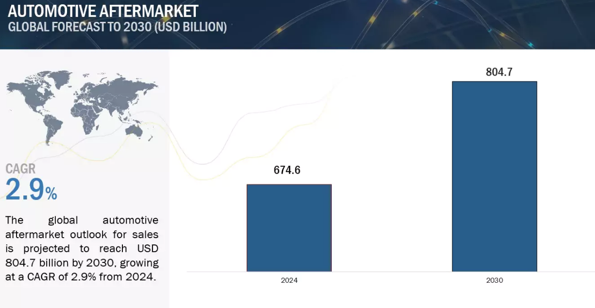 但深入了解后,你会发现:是一个体量庞大、潜力惊人的赛道。数据显示,2024年全球汽车后市场规模已达6,746.1亿美元,预计到2030年将增长至8,048.7亿美元,年复合增长率约为2.9%。