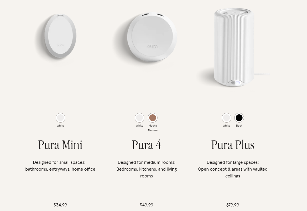 Pura 的产品矩阵覆盖家庭所有空间:Pura Mini 主打卧室与书房,Pura 4 适用于中型客厅,Pura Plus 面向大户型覆盖,Pura Car 与 Car Pro 则把香气延伸到日常通勤。