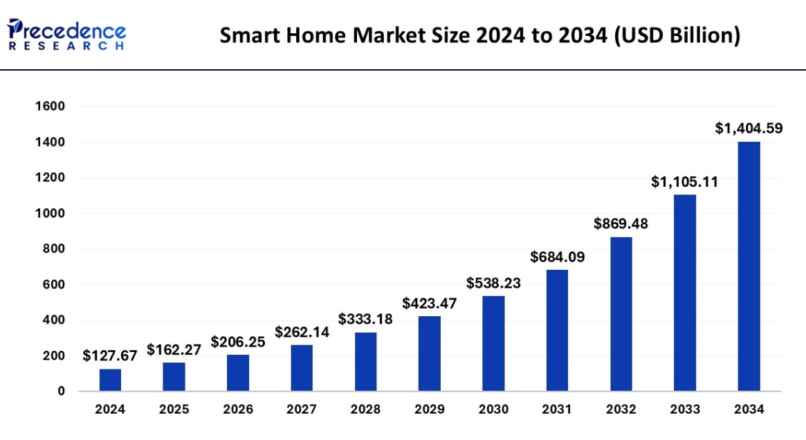 数据显示,2024 年全球智能家居市场规模达 1276.7 亿美元,到 2034 年预计增长至 1.4 万亿美元,年复合增长率高达 27.1%。