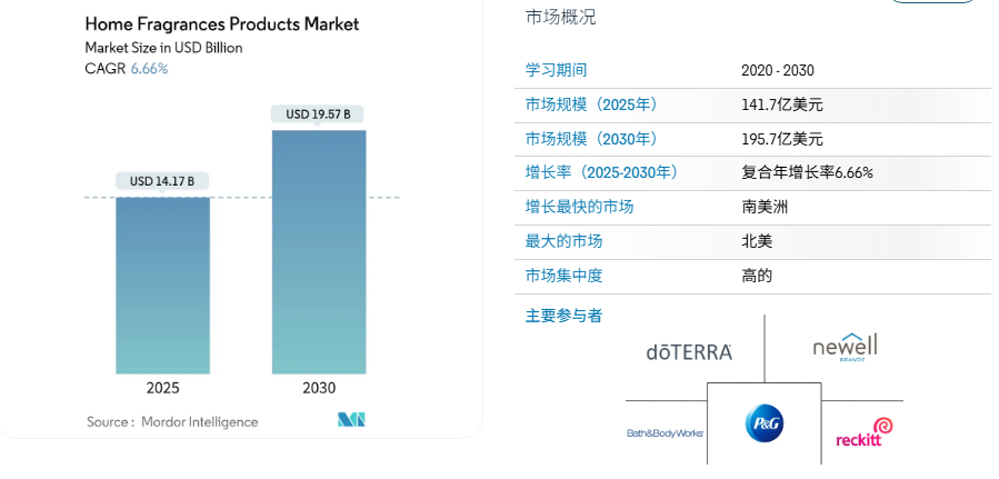 与此同时,家用香薰赛道也在稳步扩张,预计2025 年市场规模将达 141.7 亿美元,2030 年增至 195.7 亿美元,年均增速约 6.7%,其中北美依然是最大市场,占比约 35%。