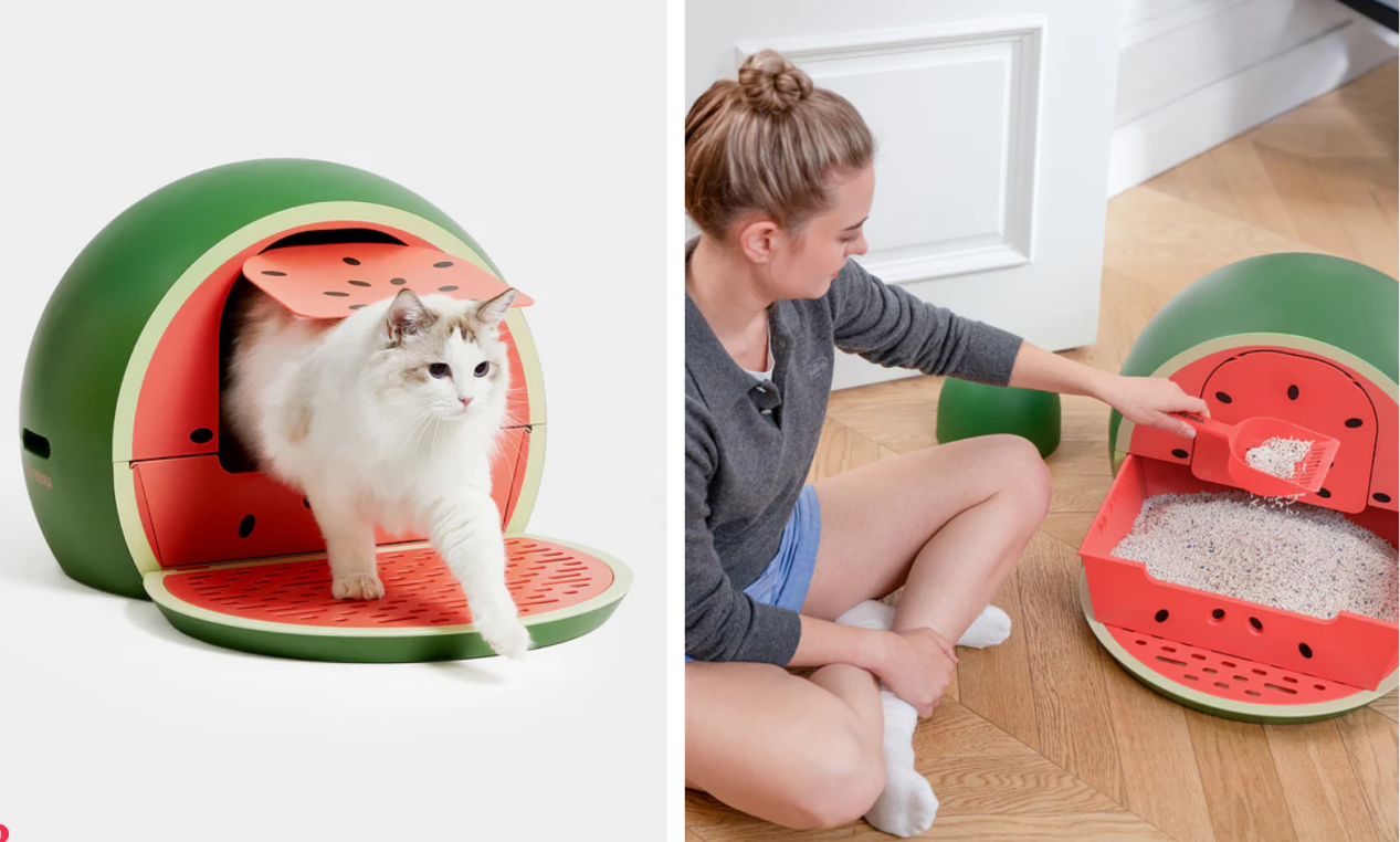 又如西瓜猫砂盆,灵感来自水果切面,亮红与草绿的配色活泼又不过分张扬。功能上依旧扎实:防溅设计、抽屉结构、密封防臭细节俱全,真正做到了“好看又好用”。