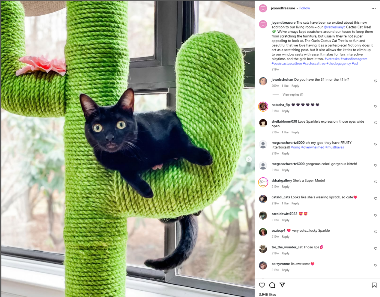 在Instagram 上,博主:joyandtreasure 则把仙人掌猫爬架当作客厅的一角出现,未作任何强调,却在评论区引发热烈讨论。这种“非宠物人群”内容,让品牌渗透到更广的审美圈层中。