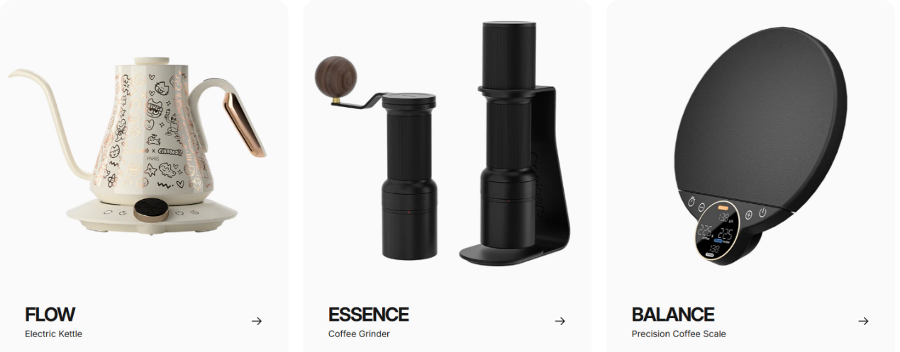 于是品牌继续加码,打造一整套标准化冲煮体系:智能电子秤、模块化磨豆机组成完整生态。