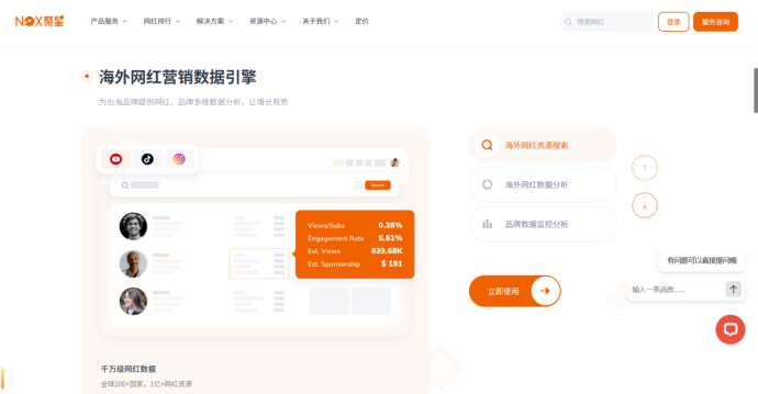 NoxInfluencer 成立于2017年,定位清晰:提供多平台红人数据检索与分析能力。它适合用于前期选人研究、备选池搭建与数据判断,但并不承担执行与交付责任。