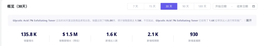 InsMark发现The Ordinary在TikTok美区小店的一款乙醇酸7%去角质爽肤水销量爆增,过去30天这款产品的总GMV增长140万美元。