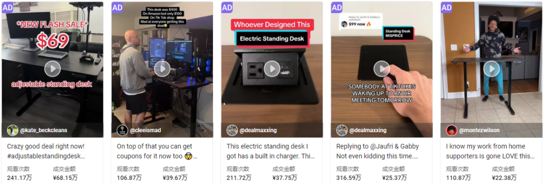 不仅如此,HUANUO还在TikTok平台上投放了带有AD标识的精准广告,进一步扩大了产品的曝光量。在平台的大数据加持下,HUANUO将广告投放至对智能办公家具有潜在需求的用户面前,确保了广告的高效触达和转化率。