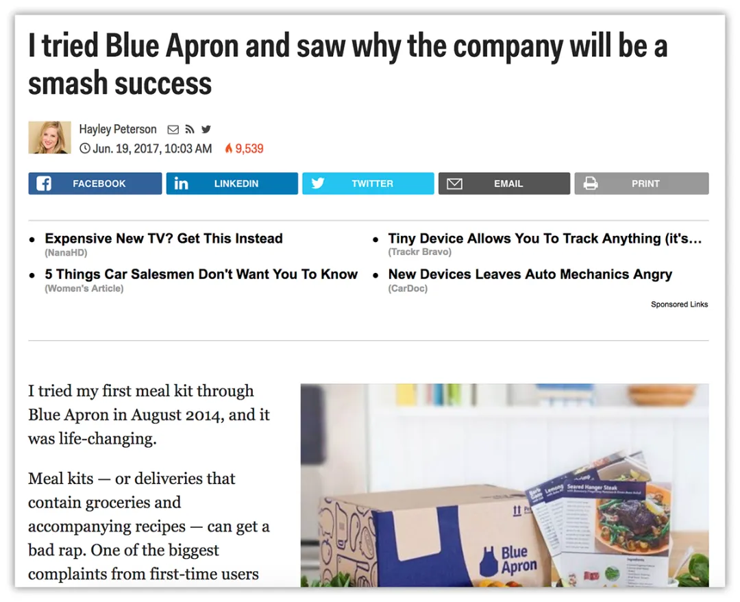BlueBird:通过详细的博客文章和社交媒体帖子,这位博主分享了她的Blue Apron体验,并展示了成品菜肴的美丽照片。其博客月访问量达到了50万次,带来了显著的品牌曝光。