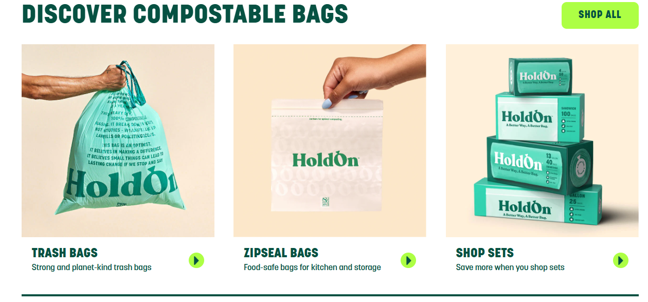 为了满足不同消费者的需求,HoldOn推出了多款产品线,包括可堆肥厨房垃圾袋、浴室垃圾袋、拉链密封三明治袋和食品袋,价格从13美元到26美元不等。每款产品设计美观,采用清爽的环保绿色配色,并且带有拉绳设计,使用起来非常方便。