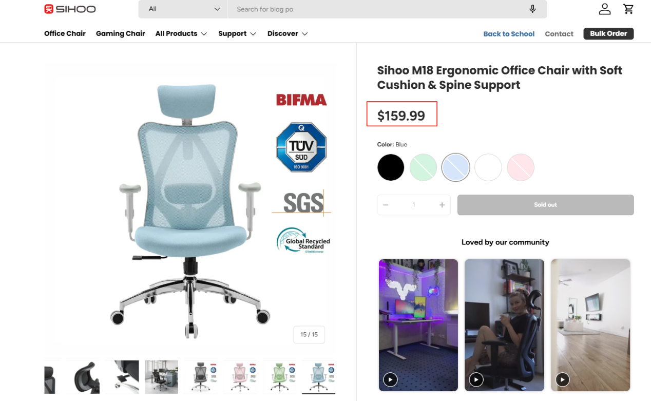 Sihoo 看到这个缝隙。2018年,它在亚马逊美国站上线首款 M18 人体工学椅,定价 159~175 美元,精准落在“高于低价、远低高奢”的心理区间。上线首月卖空库存,半年销量破8000张,全年突破2.1万张。随后三年,Sihoo加速向欧洲、东南亚、拉美扩张,凭借产品体验和定价策略稳住了中高端市场的心智。
