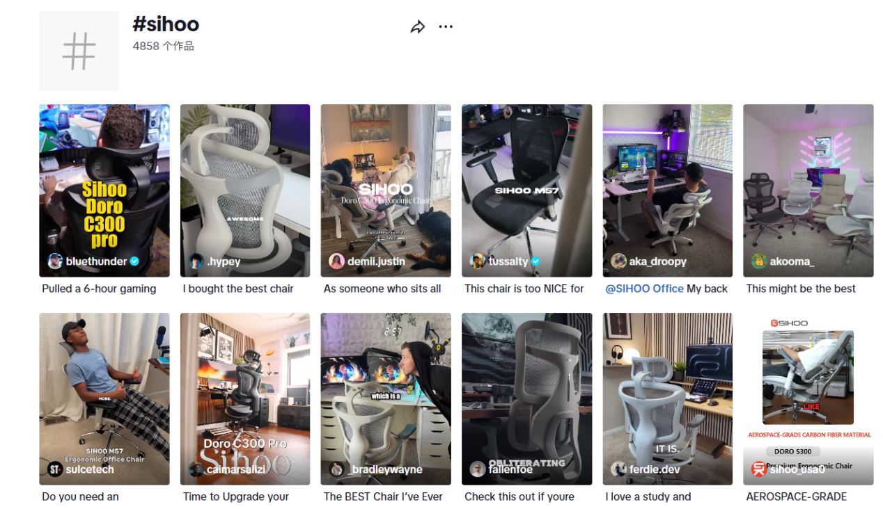 第三步是制造场景感。在Instagram 上的家居美学短片、TikTok 剧情短视频、Facebook 晒房晒书房的帖子里,用户只要对办公椅子有需求,在社媒平台上就能看到Sihoo这个品牌。